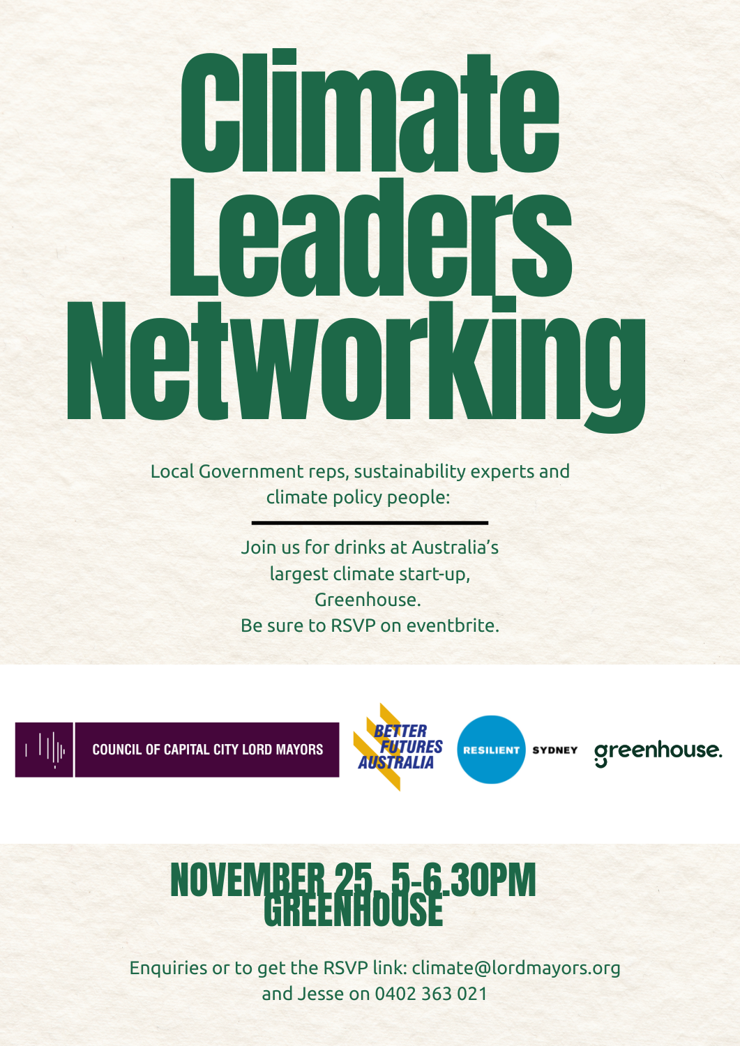 Calling those working or interested in local government, climate policy and advocacy, or sustainability spaces: you're warmly invited to a networking function at Greenhouse on the afternoon of Tuesday 25th November, from 5-6.30pm, in partnership with some capital city Lord Mayors.